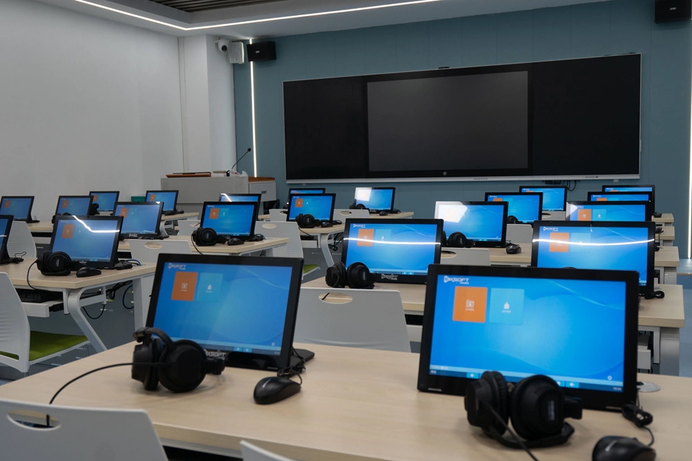 自校門步入這座占地512畝的校園,教學樓、圖書館與行政樓分立在廣場三側,構成了該校區(qū)的學習與辦公區(qū)。在左側的教學樓內,設有78間教室、14間公共機房與24個不同功能的實驗室。“除了傳統(tǒng)的多媒體教室,教學樓內還設有小組研討型智慧教室、數字化語音實驗室等,可以有效滿足不同專業(yè)、課程的授課需求。”鄧楠介紹。