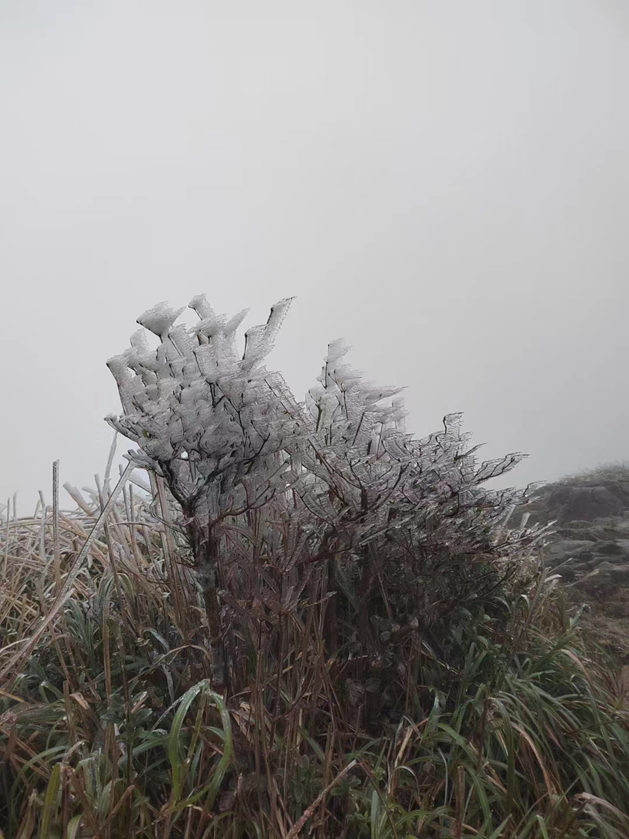 除羅浮山之外,象頭山的海拔高處也進入了奇幻的“冰雪世界”。樹枝、綠葉等被冰層包裹著,猶如冰雕藝術品。