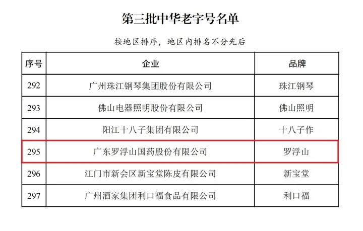 據(jù)了解,2006年年底,商務部認定第一批中華老字號;2010年,認定第二批中華老字號。2023年2月,中華老字號示范創(chuàng)建工作啟動,對2006年和2011年先后認定的兩批中華老字號進行復核,同時推進第三批中華老字號認定。經(jīng)企業(yè)申報、地方推薦、社會公示等程序,第三批中華老字號名單于日前正式出爐,認定382個品牌為中華老字號,其中來自廣東的共17個,醫(yī)藥品牌僅2個,羅浮山國藥赫然在列。目前,全國中華老字號共有1455個。