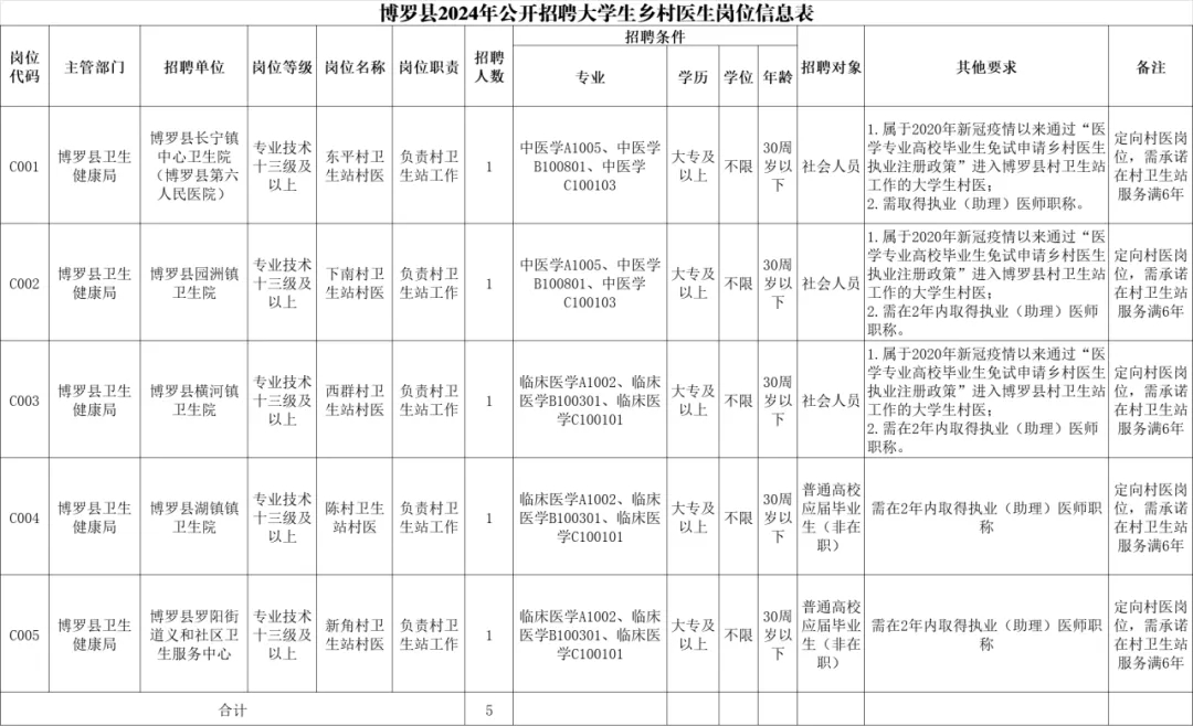 為解決我縣鄉村醫生緊缺的問題,改善我縣鄉村醫生人才隊伍結構,提高醫務工作者整體素質,根據《廣東省事業單位公開招聘人員辦法》(粵府令第301號)《廣東省衛生健康委辦公室關于加快推進大學生鄉村醫生專項編制保障和公開招聘工作的通知(粵衛辦基層函〔2024〕7號)》精神,貫徹落實“鎮招村用”有關要求,經博羅縣衛生健康局黨組研究決定,會同縣醫共體總院面向社會公開招聘大學生鄉村醫生共5名。具體公告如下: