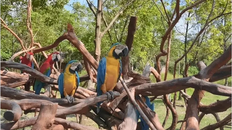 在博羅縣長寧鎮浮生六季生態園,來自南美洲的金剛鸚鵡站在樹杈上。 惠州日報記者湯渝杭 攝