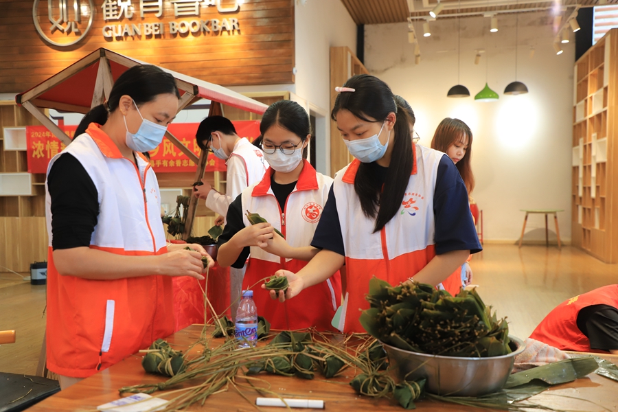 拿粽葉、放餡料、裹粽葉、纏帶子……一片片粽葉和一根根細繩在大家的手中翻飛。幾經忙碌后,一個個粽子便呈現眼前。志愿者還現場教學,教年輕一輩包粽子。