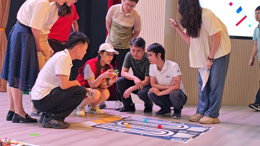 在當天的啟動儀式上,多位科普講師圍繞廣東省青少年科技創(chuàng)客大賽互通互聯(lián)“芯”挑戰(zhàn)賽、硬件編程投籃挑戰(zhàn)賽等賽項,結(jié)合機器人參數(shù)、評分規(guī)則等內(nèi)容,向現(xiàn)場志愿者做了深入淺出的講解。在演示環(huán)節(jié)中,志愿者們圍繞在3個模型周邊,觀察硬件設(shè)置、體驗小車操作并頻頻拍照記錄。
