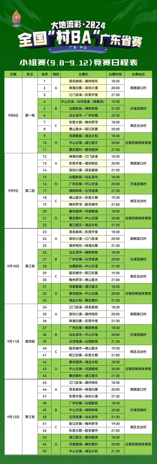根據賽程,9月8日,2024全國“村BA”廣東省賽正式開賽。首個比賽日,小組賽在中山市沙溪鎮龍瑞村、南區街道北臺村、古鎮鎮、南朗街道崖口村4個賽區同步開打。