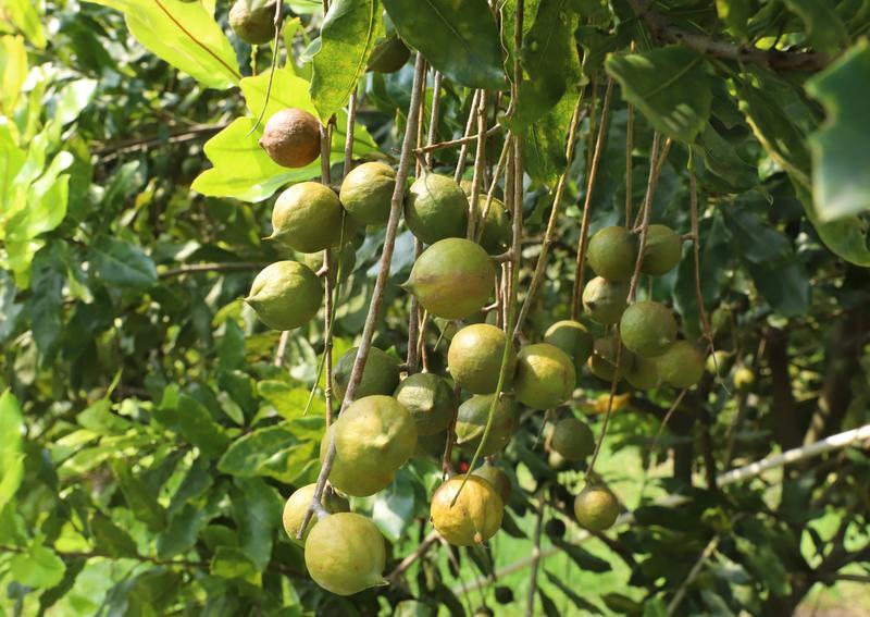夏威夷果樹屬于喬木,這片果樹現已有兩三米高,樹葉呈長圓形,帶有針刺。夏威夷果樹3月開花,經過半年的養分蓄積,進入9月后孕育出豐碩的果實。成熟的夏威夷果表皮呈深綠色,結成串垂墜在枝頭,呈現出一片豐收景象。