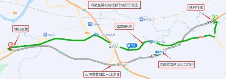 交通管制期間,長深高速北往南行駛往博羅縣麻陂鎮的車輛,請提前從埔前收費站下高速繞行國道G205前往;長深高速南往北行駛前往博羅縣麻陂鎮的車輛,請提前從楊村收費站下高速繞行國道G205前往。