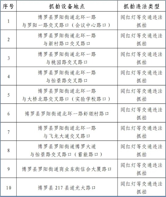 11月8日,惠州交警發布《關于公布固定式交通技術監控設備地點的公告》。博羅羅陽北環一路沿線交叉路口等路段將新增10套“電子警察”設備,主要用于闖紅燈等交通違法抓拍,希望過往駕駛人注意謹慎駕駛、安全出行。