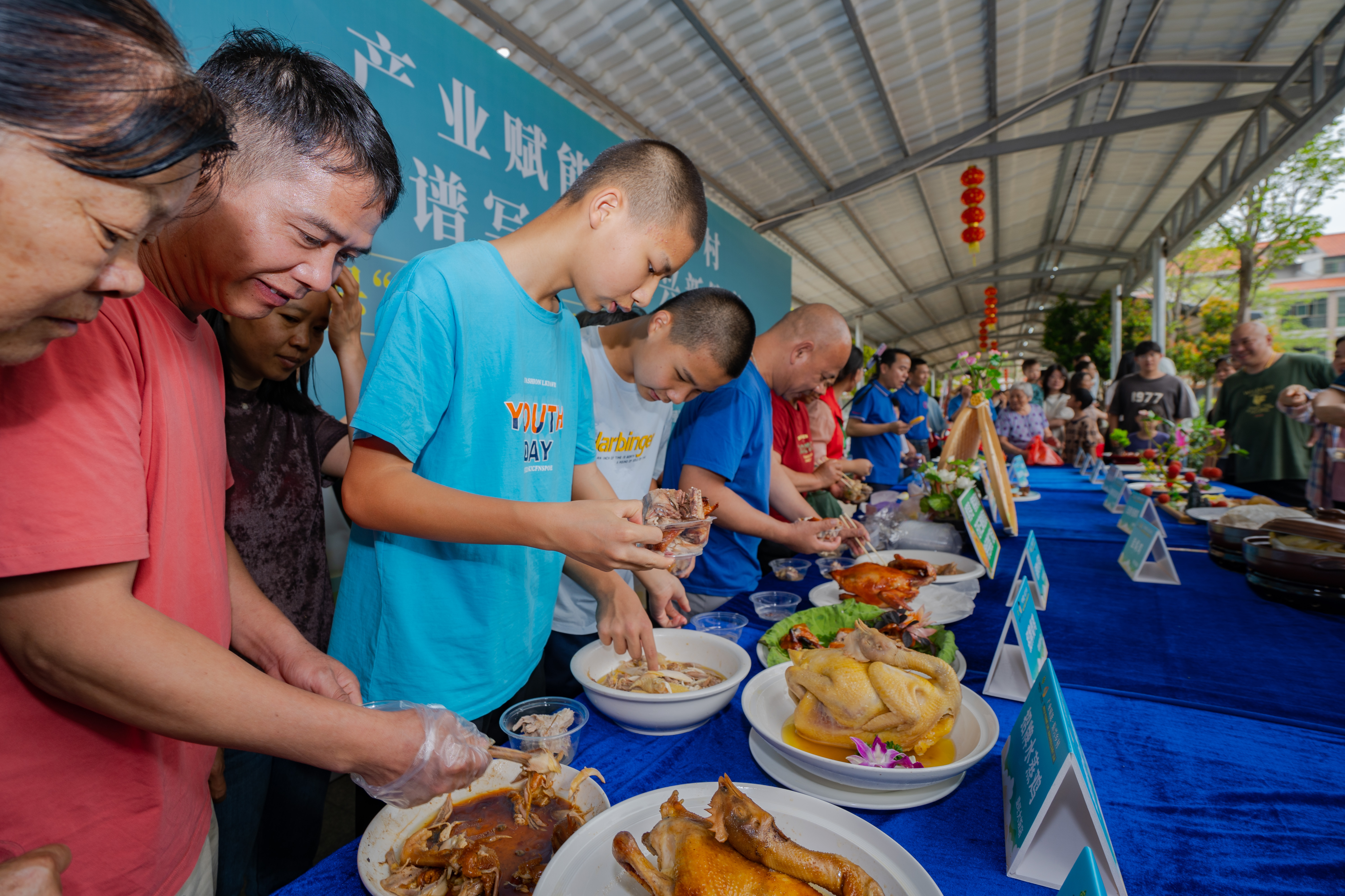 當天,“雞”祥如意游園會成為人氣焦點。文化展示區通過圖文展板系統呈現三黃胡須雞的養殖歷史、嶺南農耕文化脈絡及現代產業升級路徑,讓群眾與企業代表清晰感知產業發展脈絡;企業展銷區匯聚當地龍頭企業,現場展示雞蛋、蛋卷、鹽焗雞等多種產品,搭建起產銷對接通道;美食廚藝區邀請10家本地餐飲單位以三黃胡須雞為主材,現場烹制白切雞、松露脆皮雞、菊花撈雞等經典與創新菜品,展現石壩三黃胡須雞的多元烹飪可能。