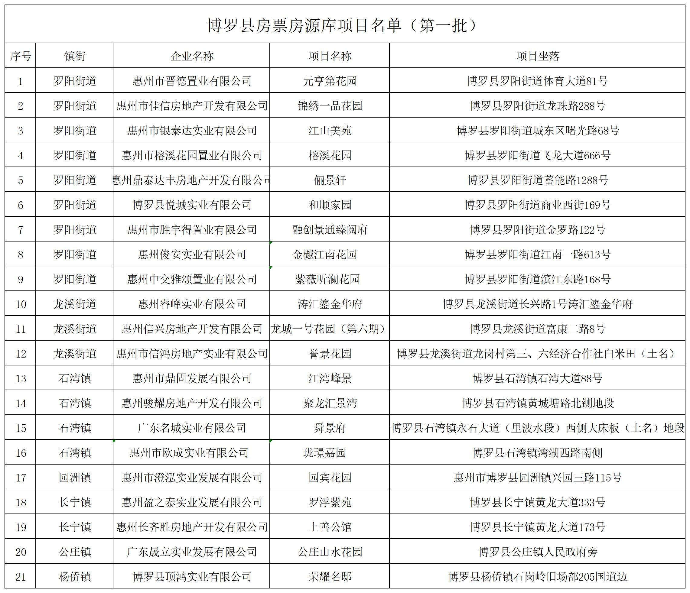 記者留意到,第一批房票房源名單涉及全縣21個房地產項目,涵蓋了羅陽街道、龍溪街道、石灣鎮、園洲鎮、長寧鎮、楊僑鎮、公莊鎮等多個鎮街的樓盤。根據《關于公開征集博羅縣房票房源的公告》,房票房源由房地產企業自主報名,經核實確認首批征集的房票房源,并予以公示。