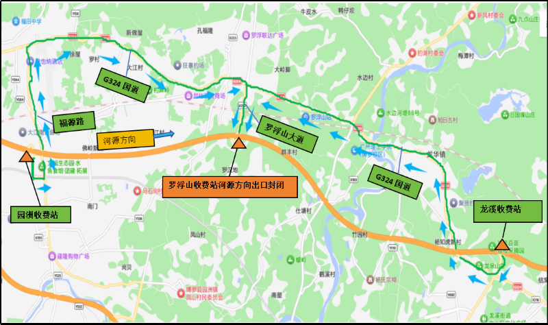 羅浮山收費站惠州方向出口封閉繞行示意圖。