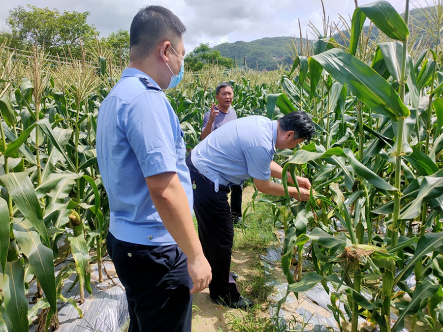 市司法局強(qiáng)戒所第一黨支部黨員深入田間地頭了解農(nóng)作物情況。
