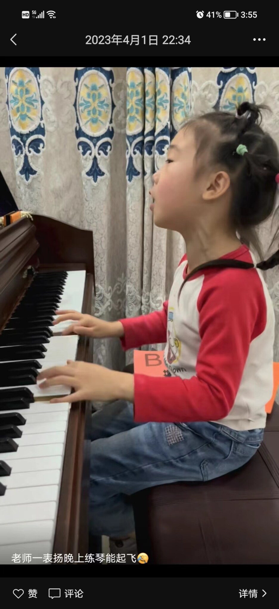 王女士說,4月1日晚上10點半,她看時間比較晚了,就囑咐云朵彈完最后一遍《我們的祖國是花園》趕緊睡覺,彈的時候她就用手機錄了下來。“我跟她說‘哇哈哈’沒有這么快的,她說‘哇哈哈’就是這么歡快的,她對歌曲有自己的理解。”王女士說,當時她在朋友圈也發(fā)了,還配了一段文字“老師一表揚,晚上練琴能飛起”,說的就是當時云朵一邊彈琴一邊唱的激情狀態(tài)。