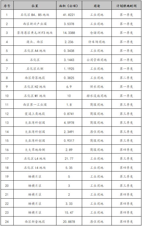 在助力區域基礎設施建設方面,《供應計劃表》共計安排了澳頭、西區、石化區等片區3宗用地,分別為停車場用地、公用管廊用地和排水設施用地,面積規模為15.38公頃,占比規模約10%。