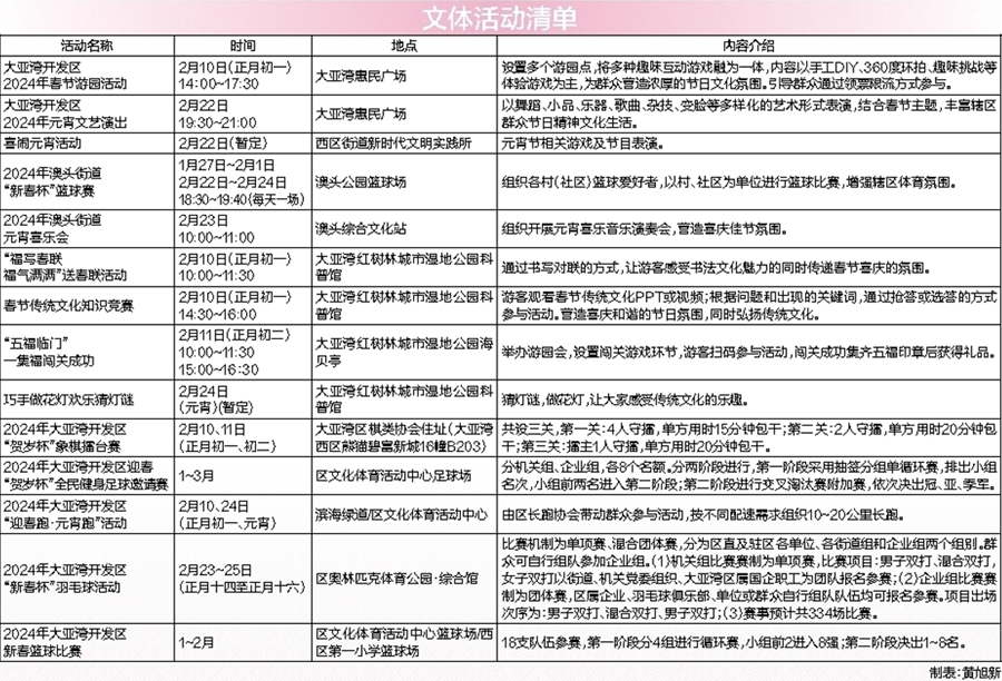 惠州日報訊 (記者黃旭新 通訊員溫艷娜)近日,大亞灣開發區發布2024年春節元宵期間活動整體安排。今年大亞灣在迎新活動、文旅產品、服務保障等各方面精心籌劃,讓在大亞灣過年的市民游客感受年味更濃、市場更旺、煙火氣更足的龍年新春。