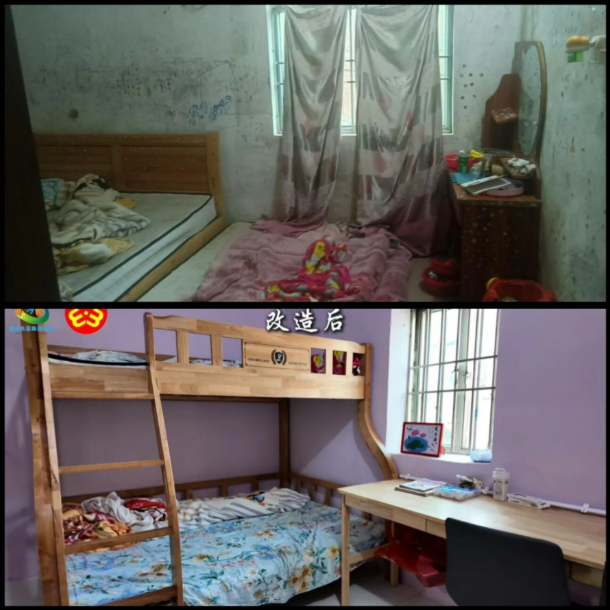 針對這些實際問題,改造團隊用心改造:為小雨家修補墻面、更換窗戶與上下床,添置書桌衣柜;給小星家的房間刷白煥新,配齊床品與學習用具;為小年家搭建輕便隔墻,劃分出獨立學習區——通過細心改造,為孩子們創造了一個良好的居住、學習和個人生活空間,實現空間與兒童心理的雙重煥新。