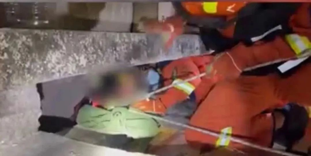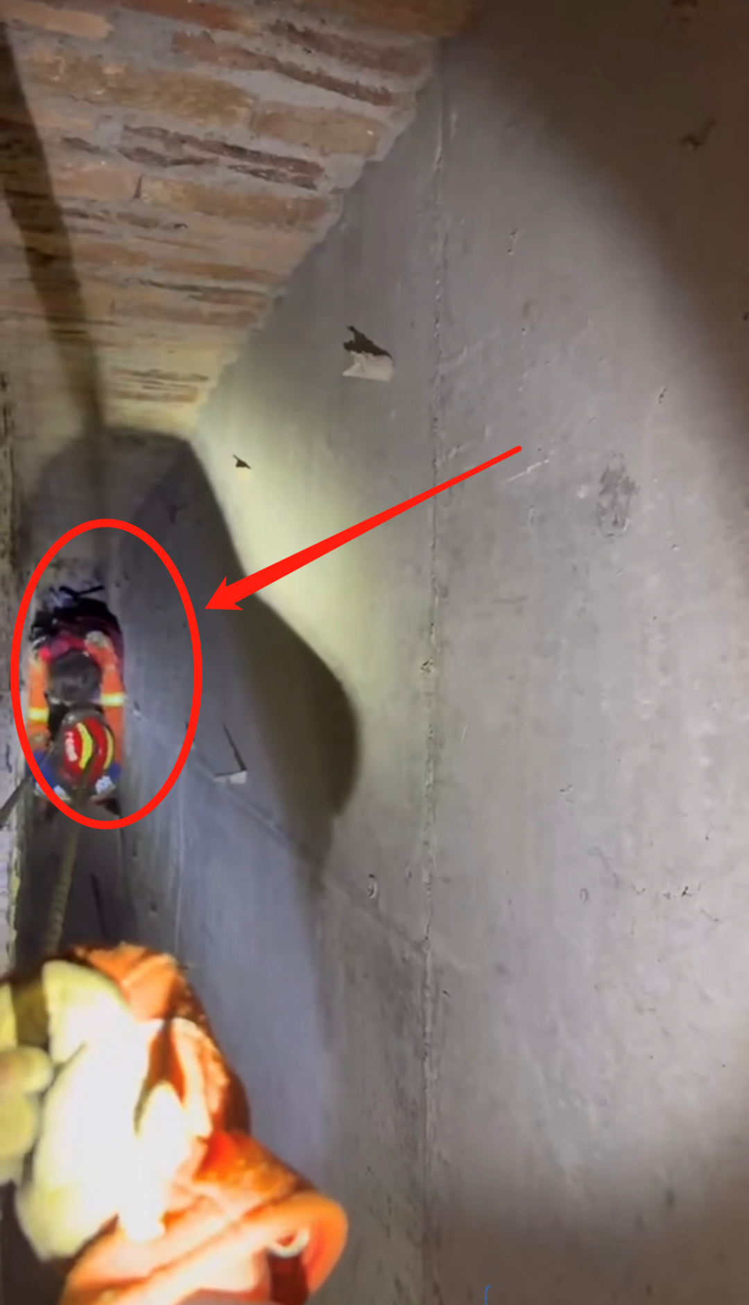 消防救援人員到達現場后,第一時間對現場進行偵查,發現小朋友掉落在一個約40厘米寬,10米深的夾縫當中,夾縫上方還有一塊水泥板,增加了救援難度,現場指揮員立即組織制作支點,利用五點式吊帶進行救援。