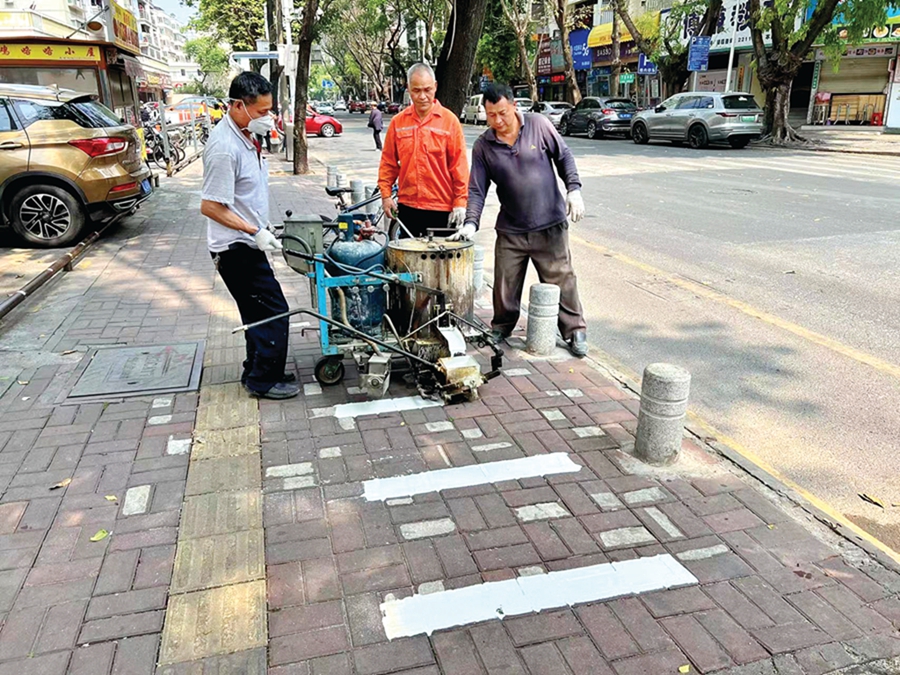 工作人員在增劃電動車停車格。 惠州日報記者彭紅霞 特約通訊員廖晨陽 通訊員周曉敏 曾嘉珺 攝