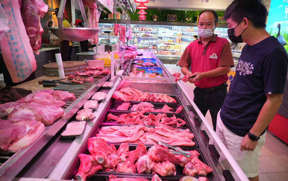 市民在超市選購豬肉。惠州東江圖片社資料圖