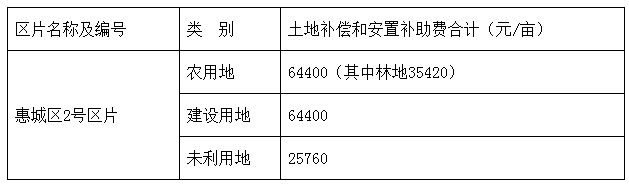 土地補償費和安置補助費按《惠州市人民政府關于公布實施征收農用地區片綜合地價的公告》(惠府公〔2021〕4號)規定的惠城區2號區片綜合地價標準執行,其中全市統一設定林地調節系數0.55,征收建設用地參照征收農用地區片綜合地價執行,征收未利用地參照征收農用地區片綜合地價設定調節系數0.4執行。
