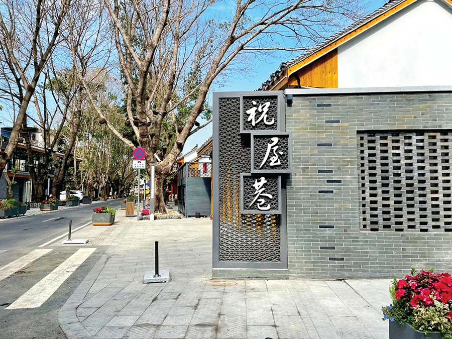 在祝屋巷的兩旁遍布著許多好玩有趣的文創(chuàng)與美食商鋪,新舊結(jié)合的建筑風(fēng)格、充滿設(shè)計(jì)感的文化墻,搭配路旁的綠樹與湖邊的美景,真可謂如詩如畫。