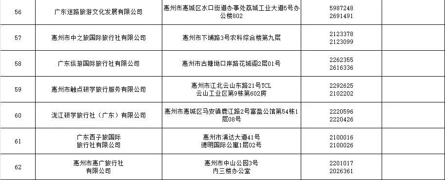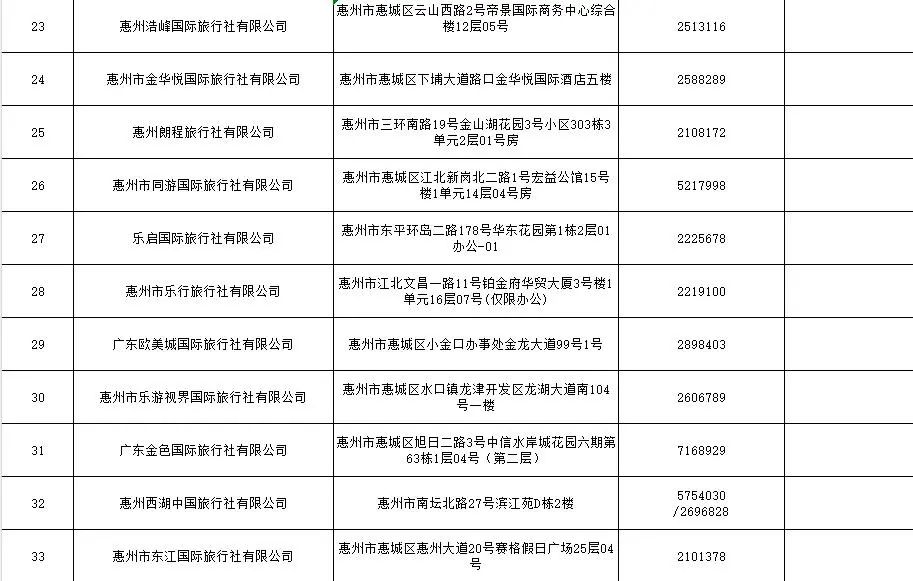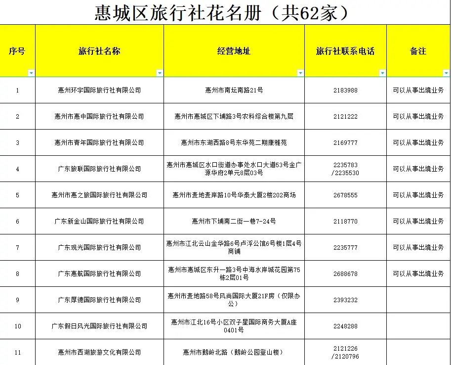 后期旅行社名單更新可登錄“惠州市惠城區文化廣電旅游體育局政府信息公開平臺”進行查詢,也可以關注“惠城文旅體”微信公眾號信息。