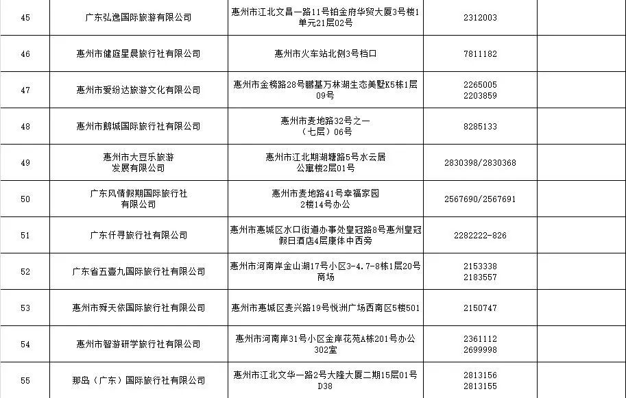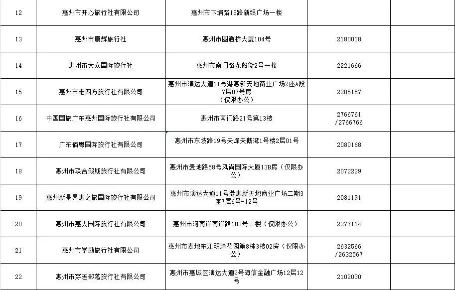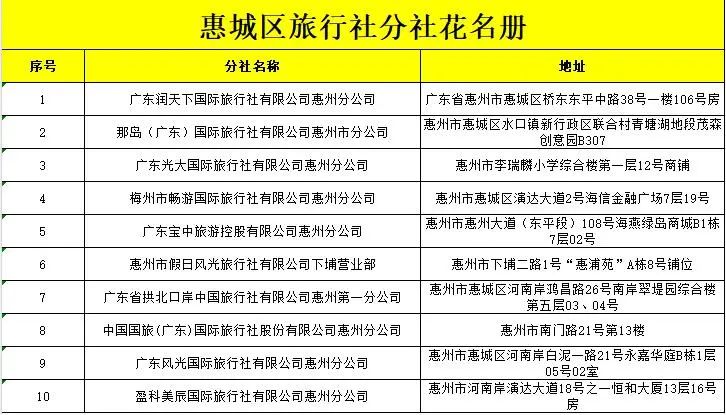 當前,惠城區注冊備案的旅行社及分社名單如下: