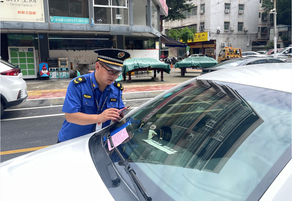 執(zhí)法隊(duì)員張貼“溫馨提示”善意勸離違停車輛。