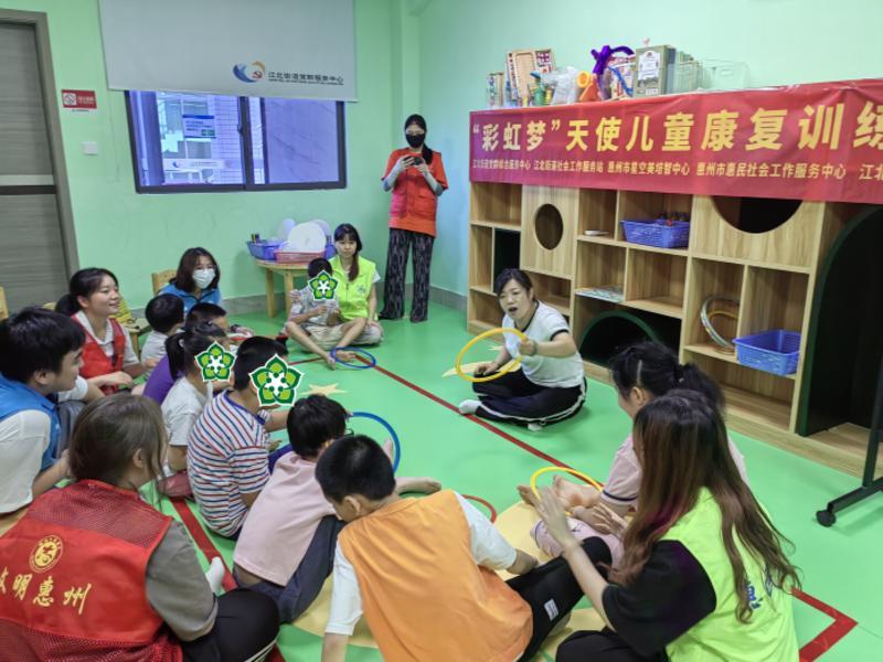 “雙百”社工和黨員志愿者為特殊兒童開展康復訓練。