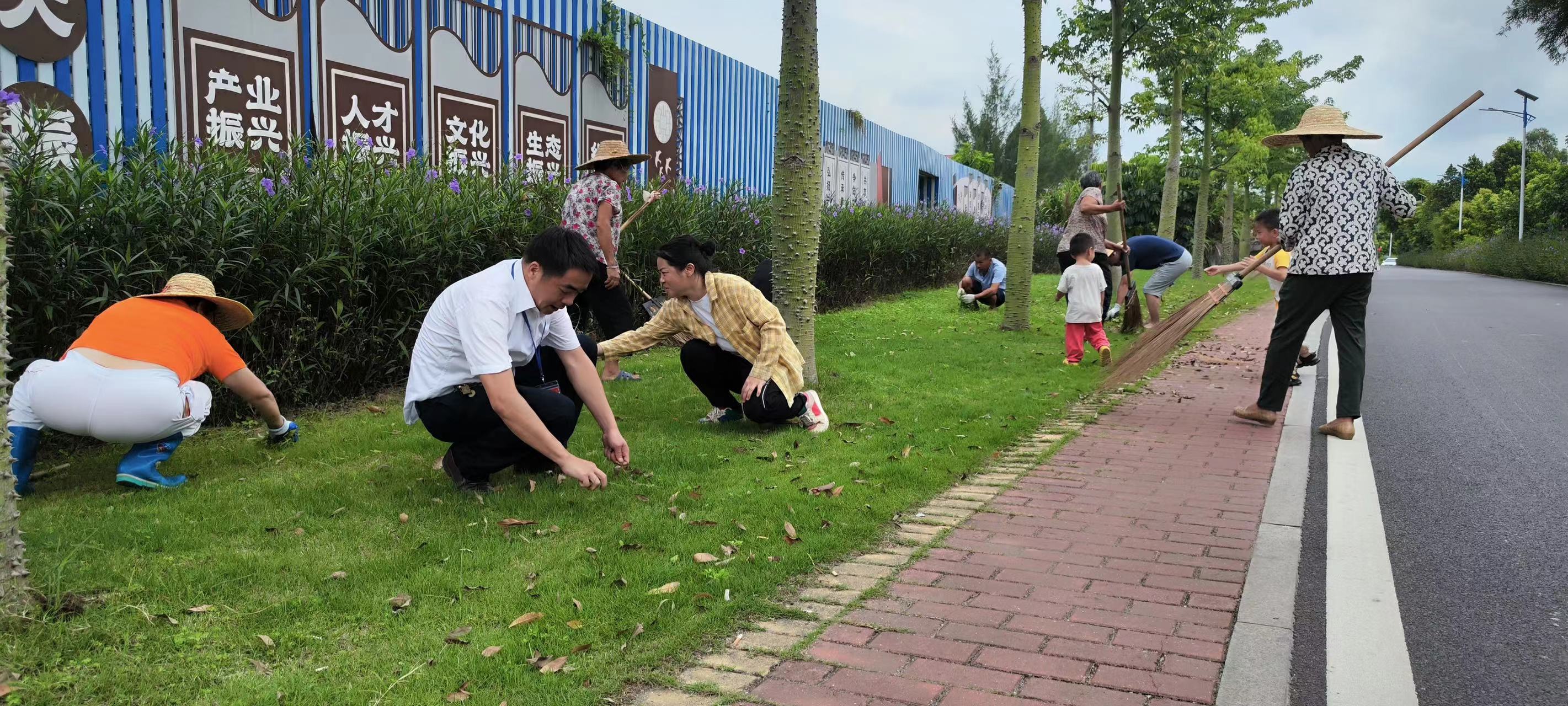 黨員與群眾一起參加義務(wù)勞動(dòng)美化村莊。