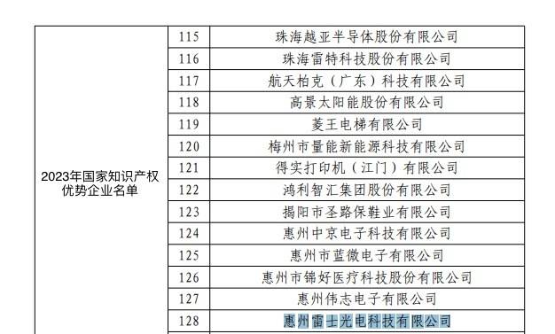 日前,國家知識產權局發(fā)布《關于確定2023年新一批及通過復核的國家知識產權示范企業(yè)和優(yōu)勢企業(yè)的通知》,來自惠城區(qū)的廣東格林精密部件股份有限公司獲評國家知識產權示范企業(yè),廣東威林科技股份有限公司、惠州雷士光電科技有限公司獲評國家知識產權優(yōu)勢企業(yè)。