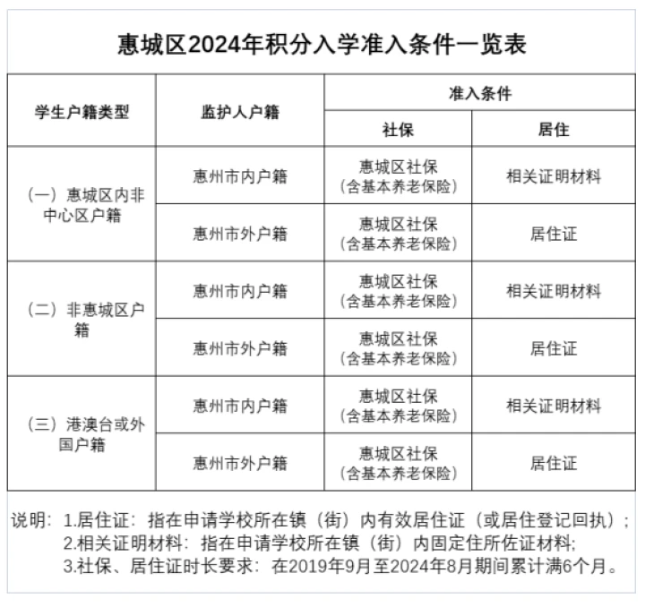 監(jiān)護(hù)人一方在2019年9月1日至2024年8月31日期間,在惠城區(qū)參加社會保險(含基本養(yǎng)老保險)時間累計(jì)滿6個月,并在惠城區(qū)居住時間累計(jì)滿6個月。