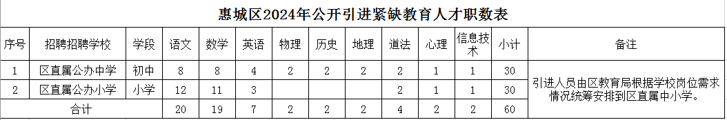 為滿足我區教育發展需要,根據《廣東省事業單位公開招聘人員辦法》《惠城區緊缺教育人才引進工作方案》等文件精神,決定面向社會公開引進緊缺教育人才,現將有關事項公告如下: