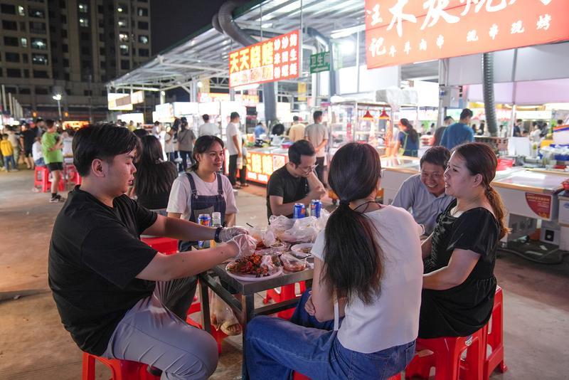 “我在東江科技園上班,放假了,和朋友一起來夜市這邊玩。”座位上,市民葉輝鴻正在和朋友一起,在歡聲笑語中,大家吃得很開心。