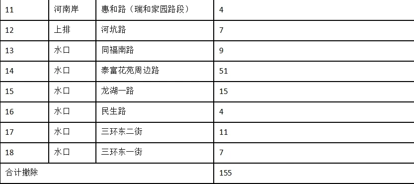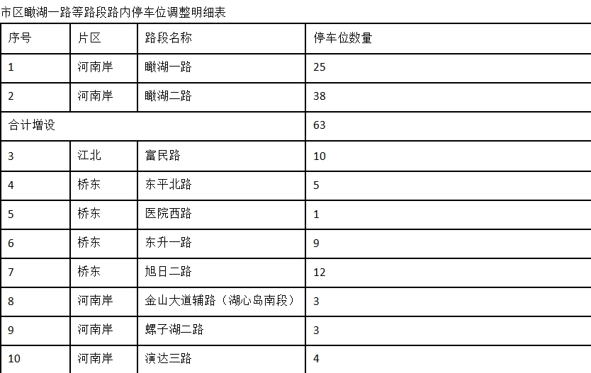 其中,河南岸片區(qū)瞰湖一路、瞰湖二路增設(shè)63個(gè)停車(chē)位。江北片區(qū)富民路,橋東東平北路、醫(yī)院西路、東升一路、旭日二路,河南岸金山大道輔路(湖心島南段)、螺子湖二路、演達(dá)三路、惠和路(瑞和家園路段),上排河坑路,水口同福南路、泰富花苑周邊路、龍湖一路、民生路、三環(huán)東二街、三環(huán)東一街16條路段撤除155個(gè)停車(chē)位。