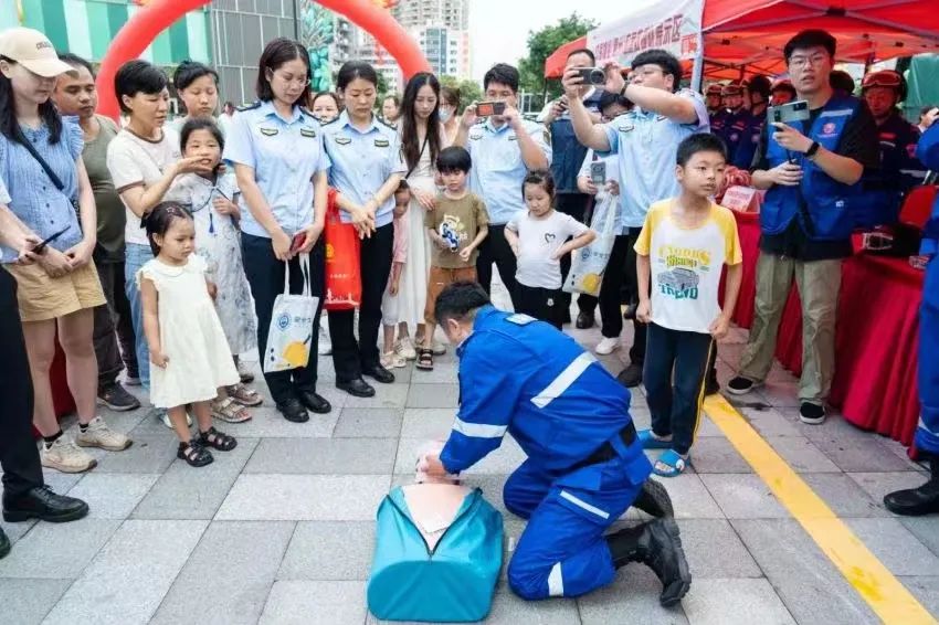 在應(yīng)急救援相關(guān)科目展示區(qū),中海物業(yè)(惠州)應(yīng)急救援隊對安全知識進行生動的場景演繹,一邊進行心肺復(fù)蘇演示,一邊講解急救知識,吸引了不少市民“打卡”,“零距離”學(xué)習(xí)應(yīng)急救援知識和技能。