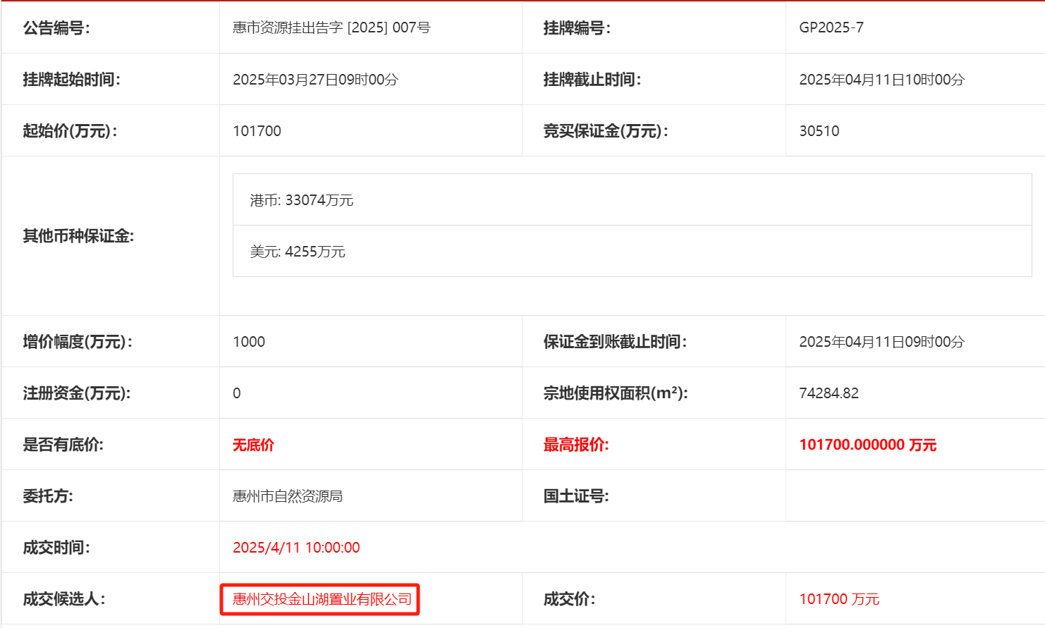此次摘牌的惠州交投金山湖置業有限公司成立于2022年,是惠州交投利臻置業有限公司100%控股的子公司;葜萁煌豆倬W顯示,惠州交投利臻公司是惠州交投集團核心二級企業之一。
