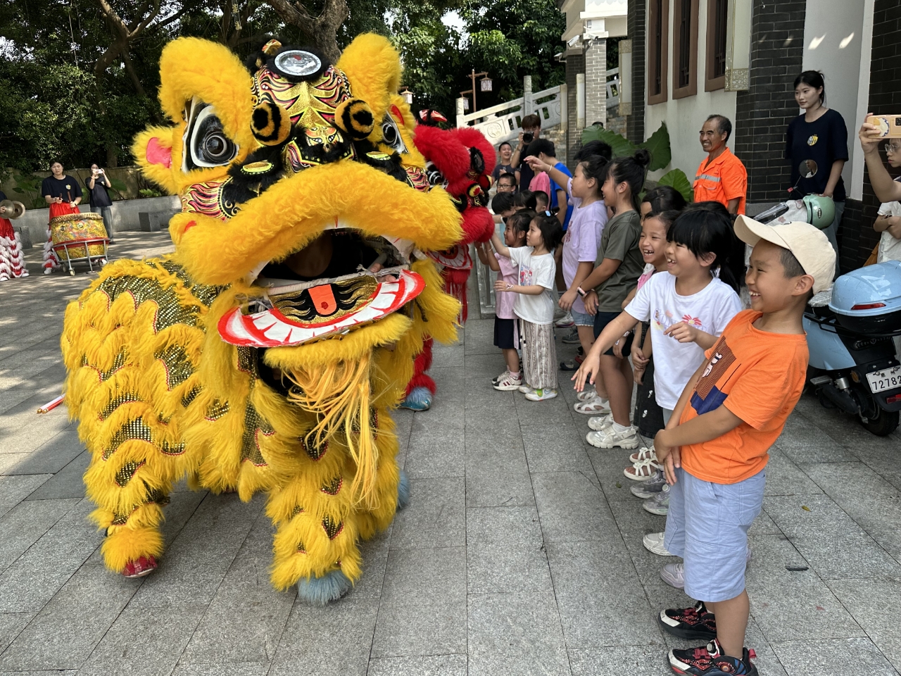 而在水北社區(qū)非遺文化傳習(xí)室,惠州衛(wèi)生職業(yè)技術(shù)學(xué)院的志愿者帶來了一群“特殊伙伴”——憨態(tài)可掬的“小獅子”。隨著鼓點(diǎn)聲響起,“小獅子”搖頭擺尾,一會兒調(diào)皮地蹭蹭孩子的手心,一會兒又突然甩頭賣萌,逗得孩子們哈哈大笑,連路過的游客都忍不住拍照定格這歡樂瞬間。