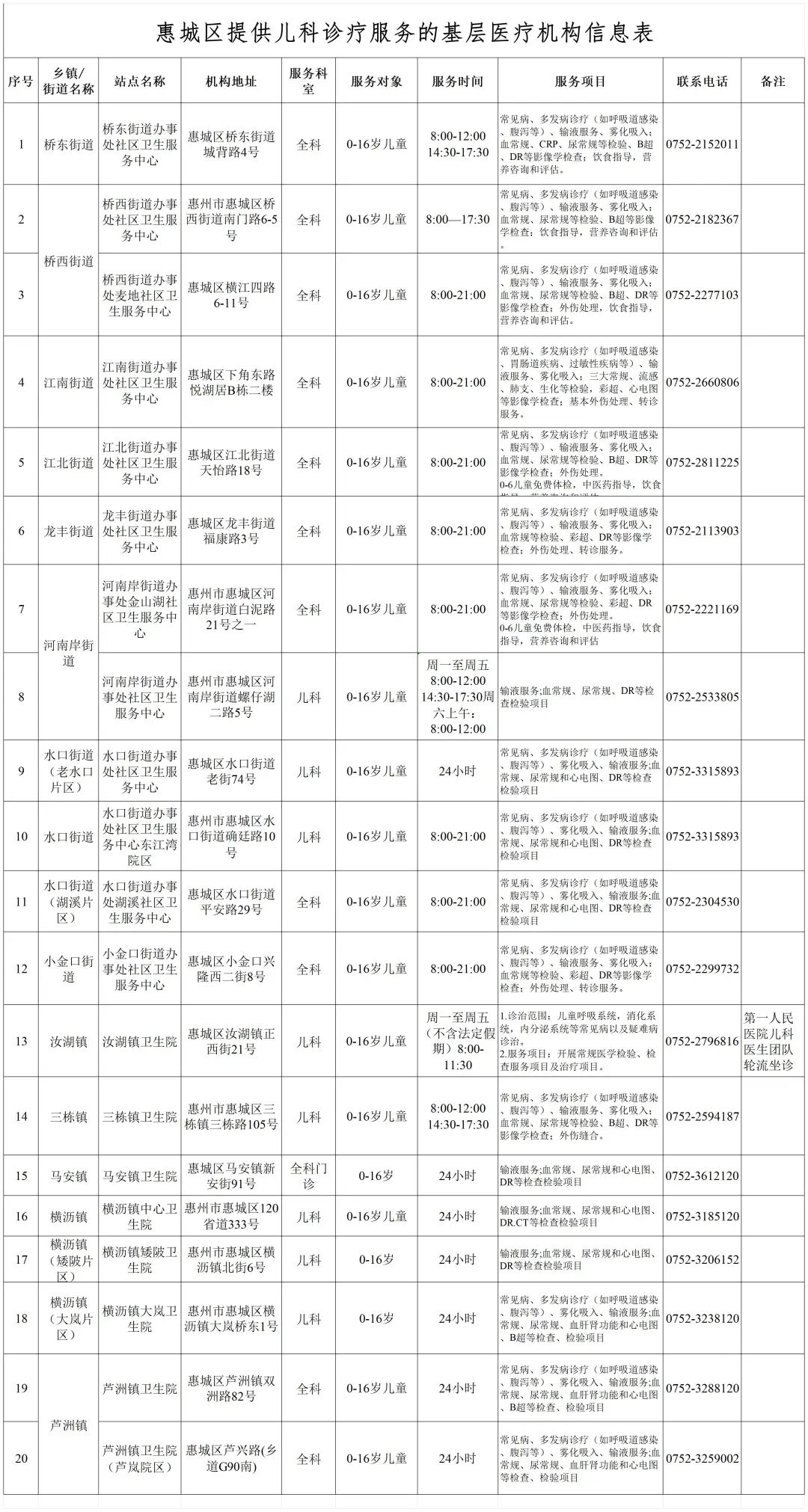 為積極應對秋冬季呼吸道疾病,進一步方便惠城區兒童患者就醫,根據國家衛生健康委員會相關工作要求,現將我區提供兒科診療服務的基層醫療衛生機構(鄉鎮衛生院、社區衛生服務中心)相關信息予以公布。以下明細表包含機構名稱、機構地址、服務科室、服務對象、服務項目及服務時間等核心內容,旨在為家長選擇兒童就醫機構提供清晰指引,保障兒童診療需求高效對接。