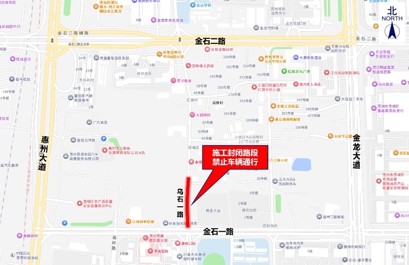 12月5日,記者從市公安局交管支隊獲悉,12月6日起至施工結束(共約60天),惠城區烏石一路(騰盛大廈西側路段,共約156米)臨時封閉,禁止車輛通行。車輛請通過周邊金石一路、金石二路、惠州大道、金龍大道等道路繞行。