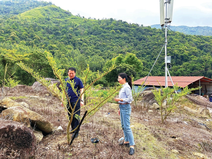 徐妙珍和同事在查看油柑種植情況。 惠州日?qǐng)?bào)記者藍(lán)斐菲 攝