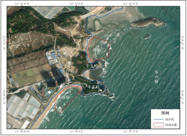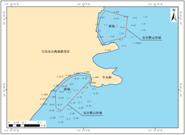 論證報告顯示,該項目位于惠東港口濱海旅游度假區東山海海域,為日出東山海旅游景區的配套項目。項目建設內容主要為兩個海水浴場,浴場一位于牛頭嶺西南側岸線,用海面積2.4432公頃,水深范圍在 0—1.8米之間;浴場二位于牛頭嶺北側岸線,用海面積2.7024公頃,水深范圍在0—1.25米之間,區域水深、波浪等自然條件適宜開展海濱浴場活動,浴場外邊界均設置安全警示浮球。