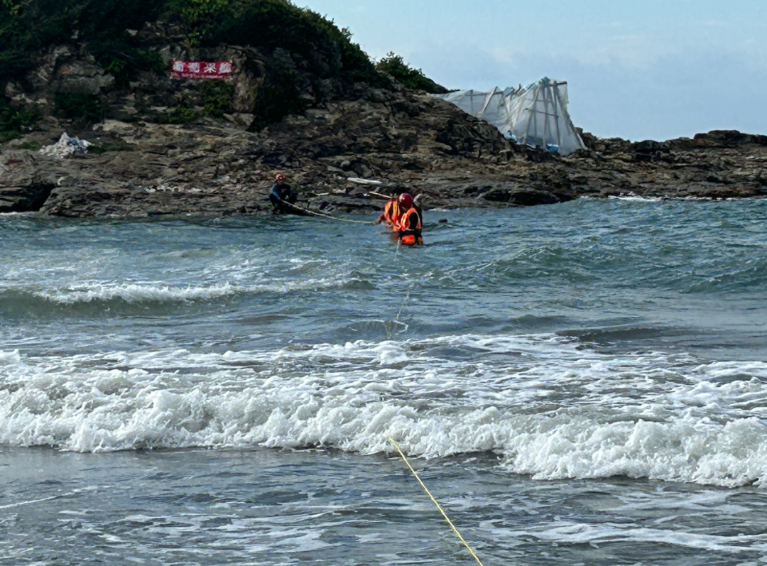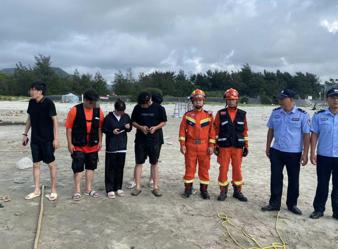 消防員到達現場后,經與現場派出所警員了解到:5人相約登島拍攝日出,結果遇上漲潮,導致無法離開。了解到情況后,消防員立即系上安全繩,帶上救生衣和救生圈前往島上救援。