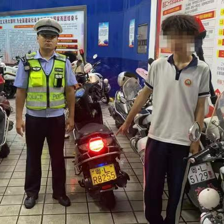 6月15日下午,惠東縣公安局交警大隊執勤民警在路面發現了一名身穿校服的少年騎著一輛白色改裝摩托車在道路穿梭,緊跟其后的是兩名少年騎著兩輛改裝摩托車加速超越,只見這三名少年在車流量不小的道路上嬉皮笑臉、互相追逐。
