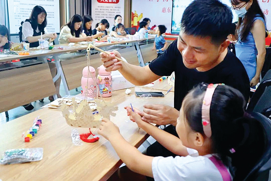 親子制作“龍舟”。 惠州日報記者藍斐菲 攝