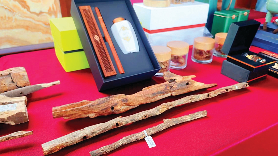 在此次研討會上,展出了眾多由惠東縣綠棋楠有關企業帶來的產品,除了天然的綠棋楠外,還有精致的香薰料、手串擺件等工藝品以及沉香酒等,惠東縣綠棋楠沉香全產業鏈條已具雛形。