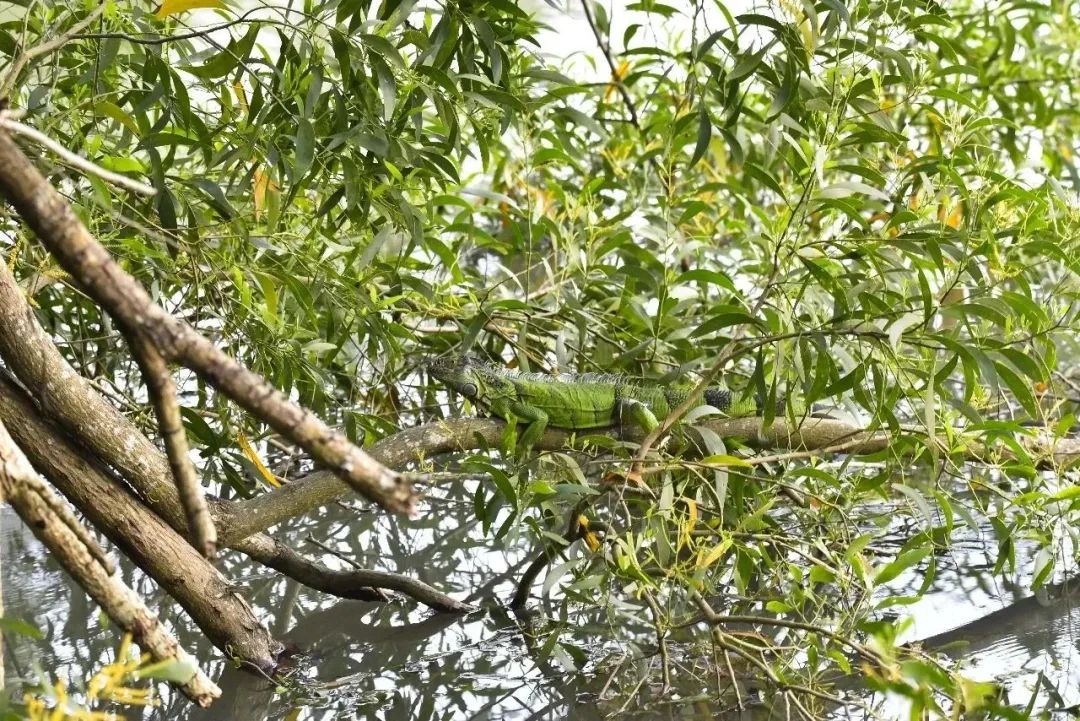 這只有著綠油油的身體、長長的尾巴、圓鼓鼓的眼睛以及極具個性“背刺”的小家伙就是綠鬣蜥。它隱藏在樹葉中,不仔細觀察很難發現。