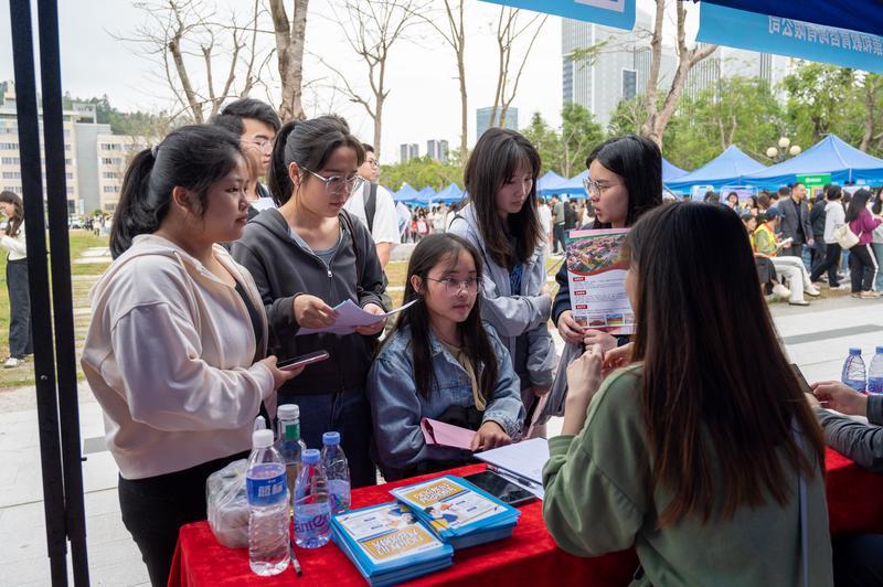 學生在春季招聘會攤位了解校招信息。 惠州日報記者洪鵲兒 攝