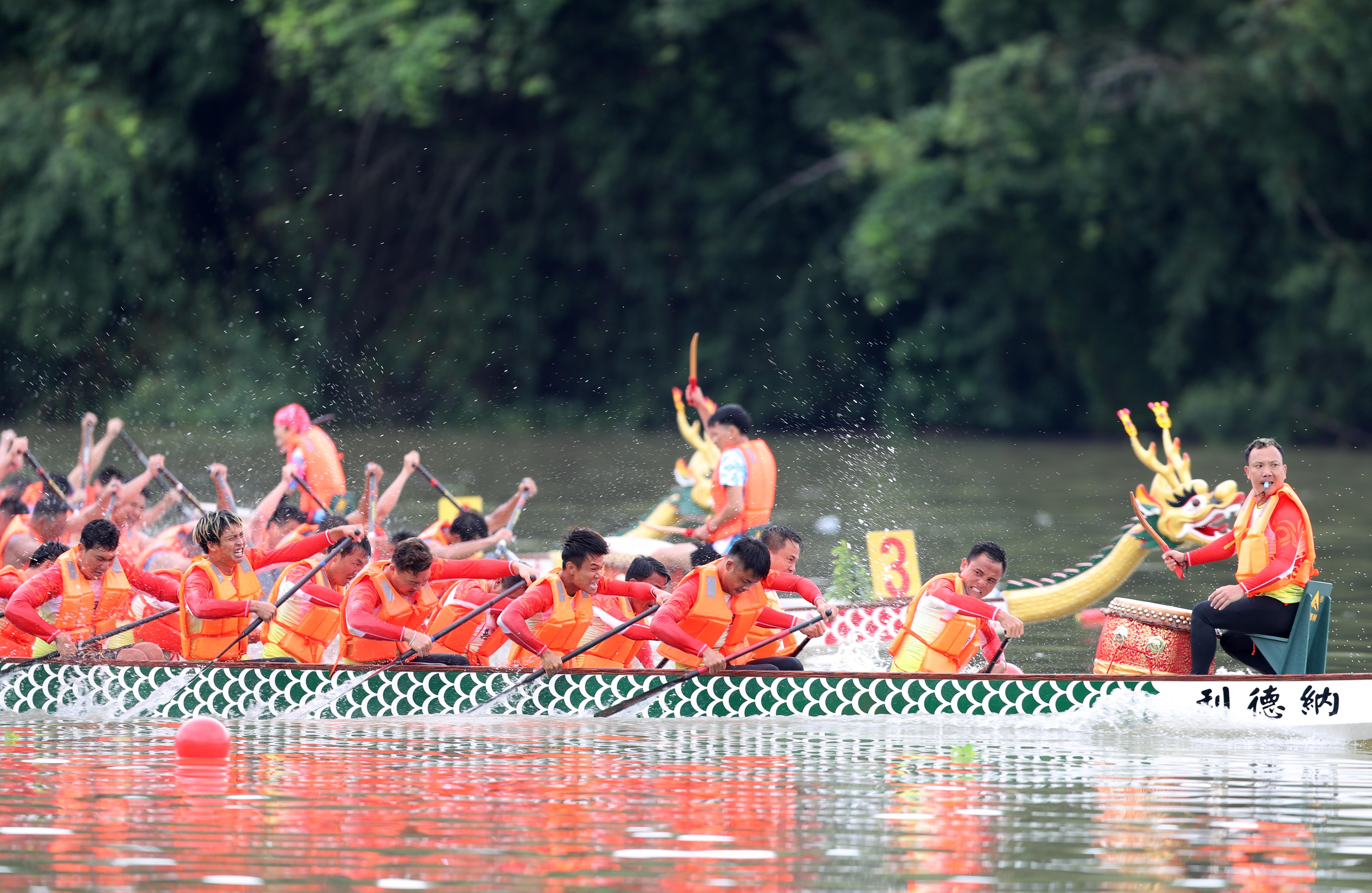 開幕式上,嘉賓們共同執筆蘸取朱砂為龍頭點睛。隨著發令鳴鑼,比賽正式拉開帷幕,8支龍舟隊在500米江面直道上開展激烈角逐,爭奪蛟龍之王桂冠。賽場鼓聲如雷,水花飛濺,船槳翻飛,一艘艘龍舟如離弦之箭破水而出,向著終點奮力沖刺,岸邊觀賽的市民游客加油吶喊聲此起彼伏。未能來到現場觀賽的市民游客則通過線上為龍舟隊助威。比賽現場氣氛熱烈緊張,起步爭先、加速追逐、并駕超越、拼搏反超……驚險刺激的場面令人熱血沸騰。最終,憑借默契的團隊配合和出色的發揮,巽寮濱海旅游度假區、鐵涌鎮、稔山鎮龍舟隊分別斬獲冠、亞、季軍。