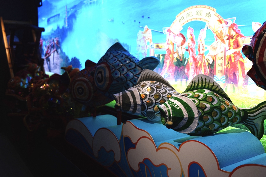 活動現場,惠東蓋子獅在大廳門口恭候各方來客。在該展廳入口處,一艘疍家屋船擺放在夕陽映照的大海幕景墻旁。疍家屋船制作技藝是市級非物質文化遺產,疍家屋船主要分布在惠東縣沿海地區。走進展廳,迎面是一幅惠東縣非物質文化遺產分布圖。沿著展廳環形走廊可欣賞各類非物質文化遺產展品:惠東蓋子師威風凜凜,頭頂盤繞的巨型草龍活靈活現,稔山女子白字戲、惠東漁歌演員造型形象逼真、表情豐富,大嶺逗姥爺表演的道具和背后真實場景圖片融為一體,體驗感十足。展廳內通過靜態展覽、動態展示、活態展演的綜合運用,不僅充分展示了惠東縣在開展非遺保護工作所取得的豐碩成果,還為群眾提供了一站式飽覽惠東非遺魅力的文化空間。