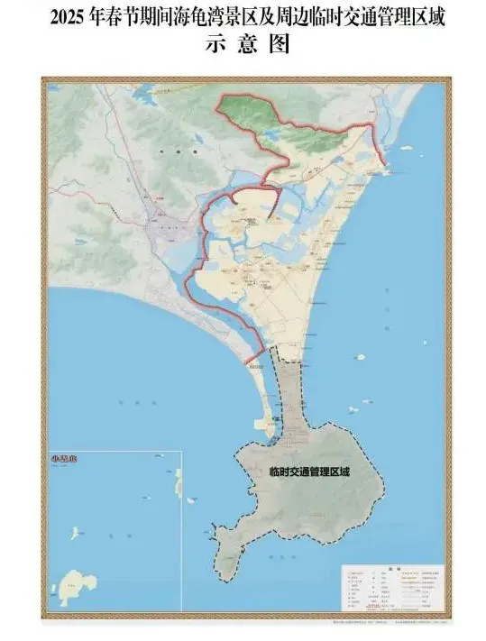 為確保2025年春節期間海龜灣景區道路交通有序、安全,根據《中華人民共和國道路交通安全法》《中華人民共和國道路運輸條例》相關規定,決定在春節期間對海龜灣景區及周邊區域道路實施臨時交通管理和配套服務措施。現將有關事項通告如下: